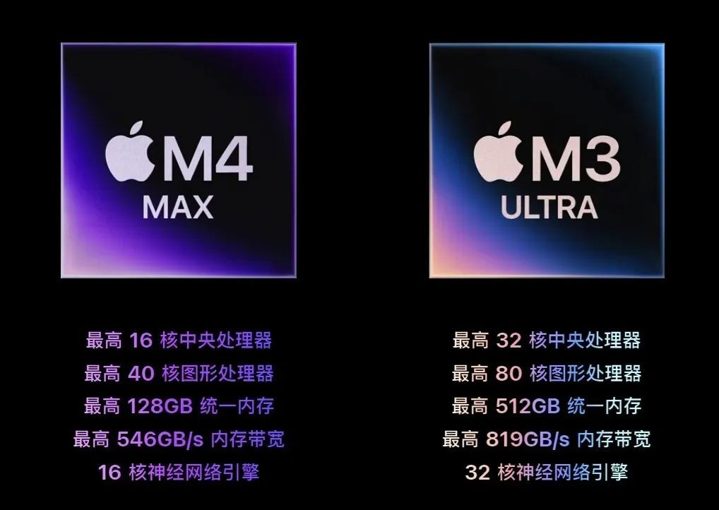 近期,M4 Max 芯片首次亮相于去年底发布的MacBook Pro 2024 款式,而M3 Ultra则是今年三月新推出的处理器。