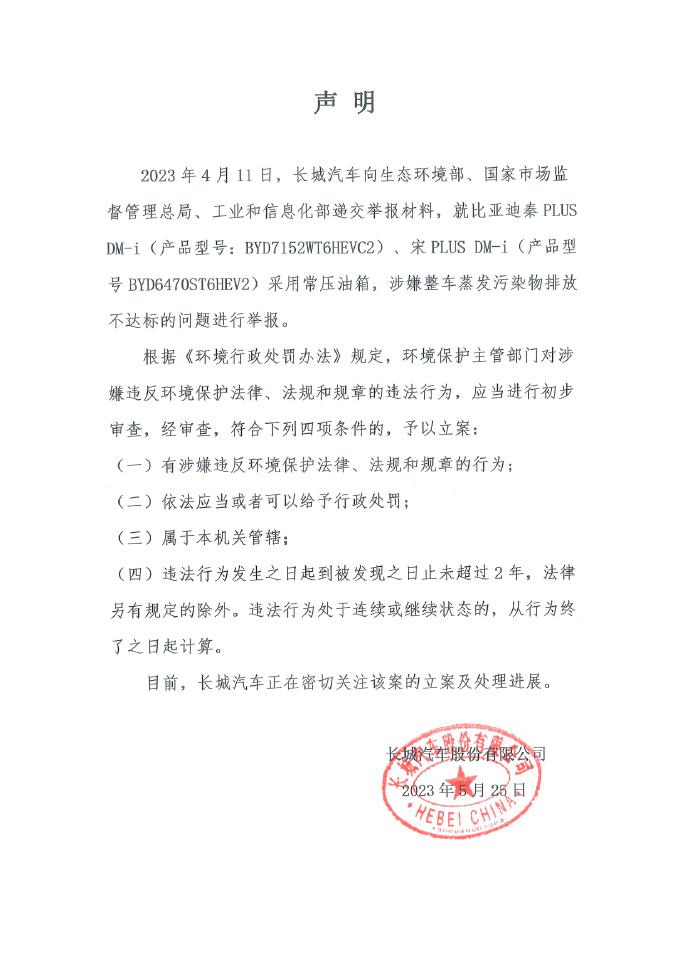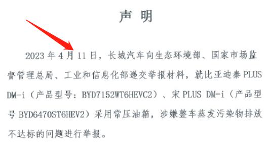 在上周也就是 5 月 25 日的时候,长城在自家的多个社交平台上发布了一个声明,举报比亚迪的两款车型秦 & 宋 PLUS DM-i ,涉嫌整车蒸发污染物排放不达标,且应该受到处罚。