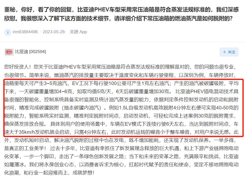 一开始,整个舆论环境也都是这么想的。但比亚迪在事情发生后的第三天,就在回答投资人问题时说到,自家的车型其实是有相应的技术,专门解决常压油箱里汽油蒸汽过多的问题的。