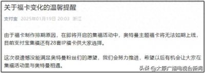 - 支付宝:福卡有变!今天正式开启…… 2025“支付宝集福”今日(1月20日)启动 支付宝发布最新提醒: 由于福卡制作排期原因,在即将开启的集福活动中, 奥特曼主题福卡将无法如期...